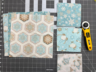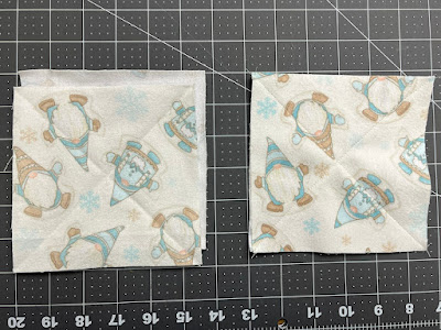 Pair each small square wrong sides together with a matching square. Stitch diagonally from corner to corner in both directions to secure the two layers. Repeat with the large squares.