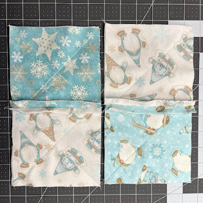 Join two pairs of small stitched squares to make a four-patch unit. Keep seam allowances pressed open.