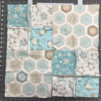 Lay out the four-patches and large stitched squares into two rows of two.