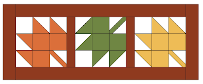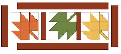 Step 1 Lay out (3) leaf blocks (rotating as desired) with (2) 2-1/2" x 12-1/2" sashing strips. Sew blocks and strips together to make the runner center.
