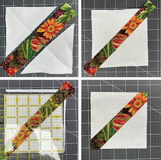 Step 2: To make the stem unit, cut the remaining 5" background square diagonally in half. Press each triangle in half along the long edge to mark the center point. Fold the 1-1/2" x 8" leaf print piece in half and press to mark the center point. Match center points and sew the triangles to the leaf print piece. Square up the unit to measure 4-1/2", centering the "stem" from corner to corner.