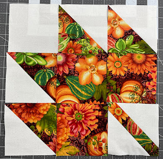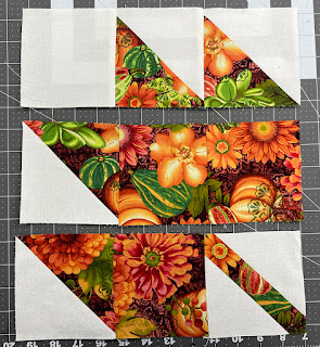 Step 3: Lay out the (4) HST units, (1) stem unit, (3) 4-1/2" leaf print squares and (1) 4-1/2" background square into (3) rows of (30, noting orientation. Sew into rows and join the rows to make (1) 12-1/2" square leaf block.