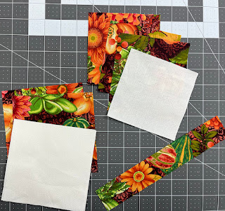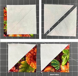 Step 1: Draw a diagonal line on the wrong side of (2) 5" background squares. Place a marked square right sides together with a 5" leaf print square. Stitch 1/4" on each side of the drawn line, cut on the line, and press units open. Square up to measure 4-1/2" square. Make (4) HST units.