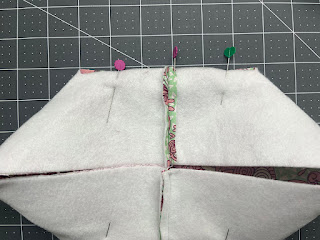 4. Match the seam on one side with the folded bottom edge to create a boxed corner. Pin the raw edges to secure, and then stitch across using a 1/4" seam allowance. Repeat on the opposite corner.